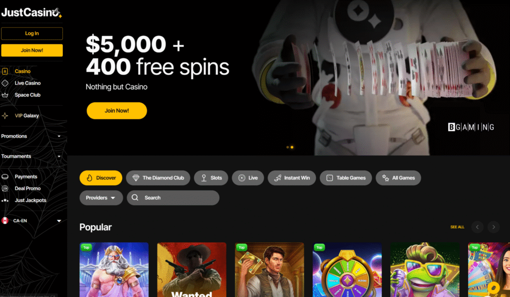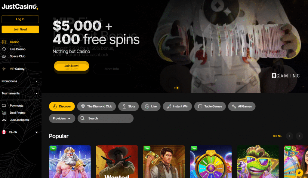 JustCasino serves BC players with 11,000+ games and up to $1,000 cashback on losses. The platform offers an exclusive first deposit bonus through certain links.