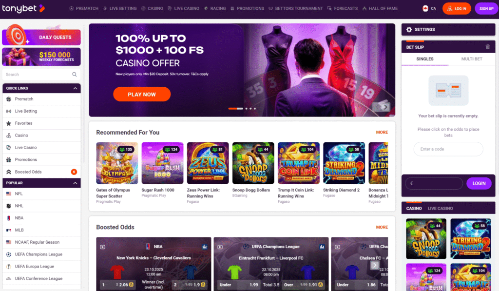 TonyBet specializes in slots and live dealer games with a massive collection available to Vancouver players. Within 48-hour payouts keep the action moving.